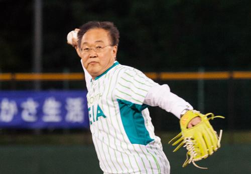 球場内を「川口宿 鳩ヶ谷宿 日光御成道まつり」キャラバン隊が練り歩き、奥ノ木市長は開催の感謝を述べ、これからも女子プロ野球をみんなで応援していきましょうと挨拶をし、始球式を行いました。