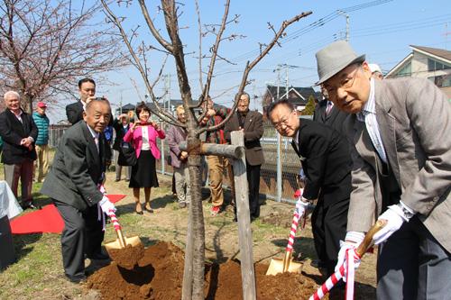 植樹者左から 安行桜を愛する会 鈴木会長、奥ノ木市長、小薗江副会長