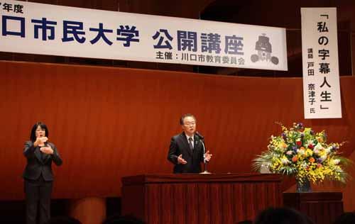 映画字幕翻訳者・通訳の戸田奈津子氏をお迎えし開催された公開講座で奥ノ木市長は「元気なまち川口で、楽しみながら生涯学んでいっていただきたい」と挨拶しました。