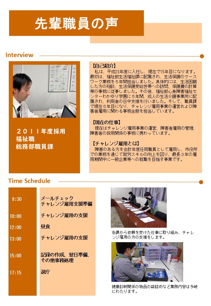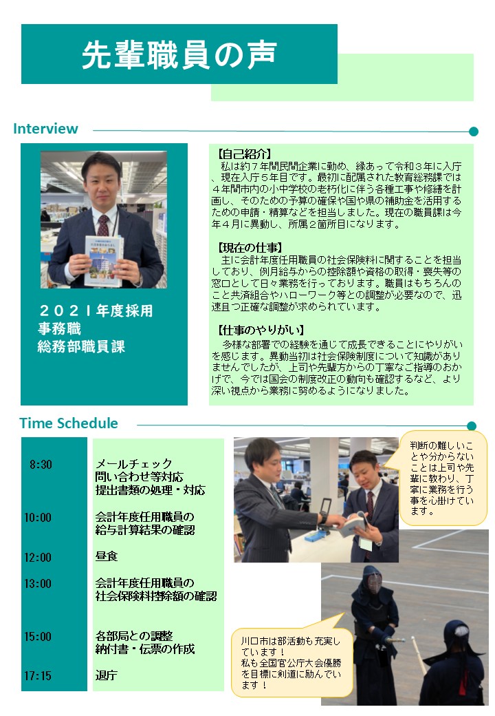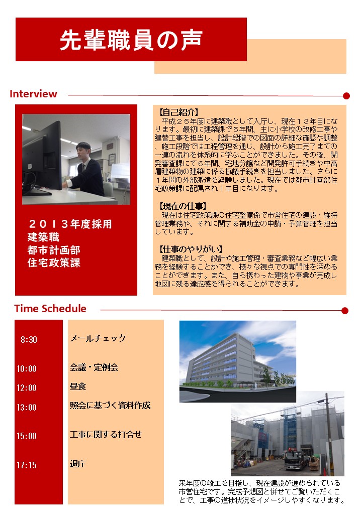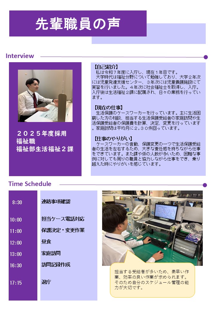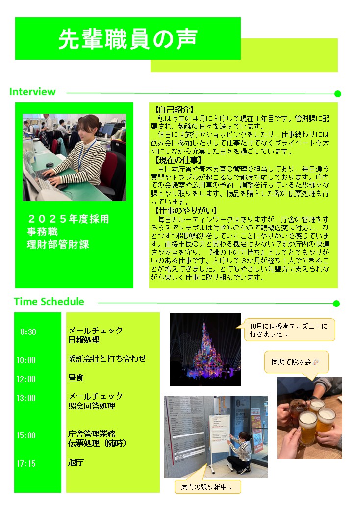 また先輩職員のリアルな一日を覗き見!ということで、登庁から退庁まで『一日のスケジュール』についても紹介しております。是非ご覧ください!