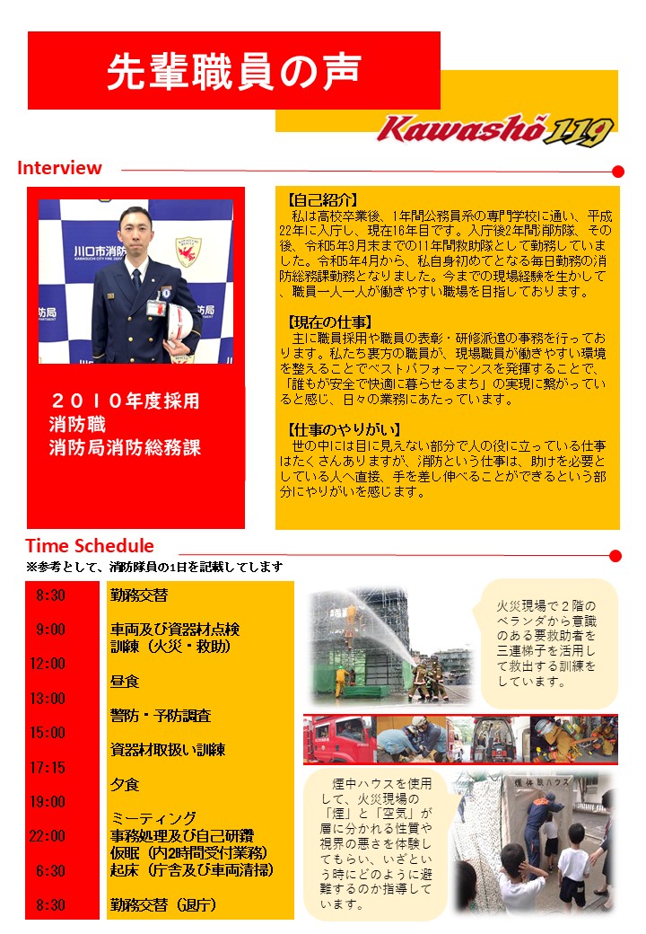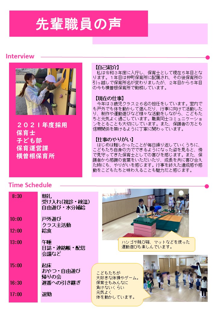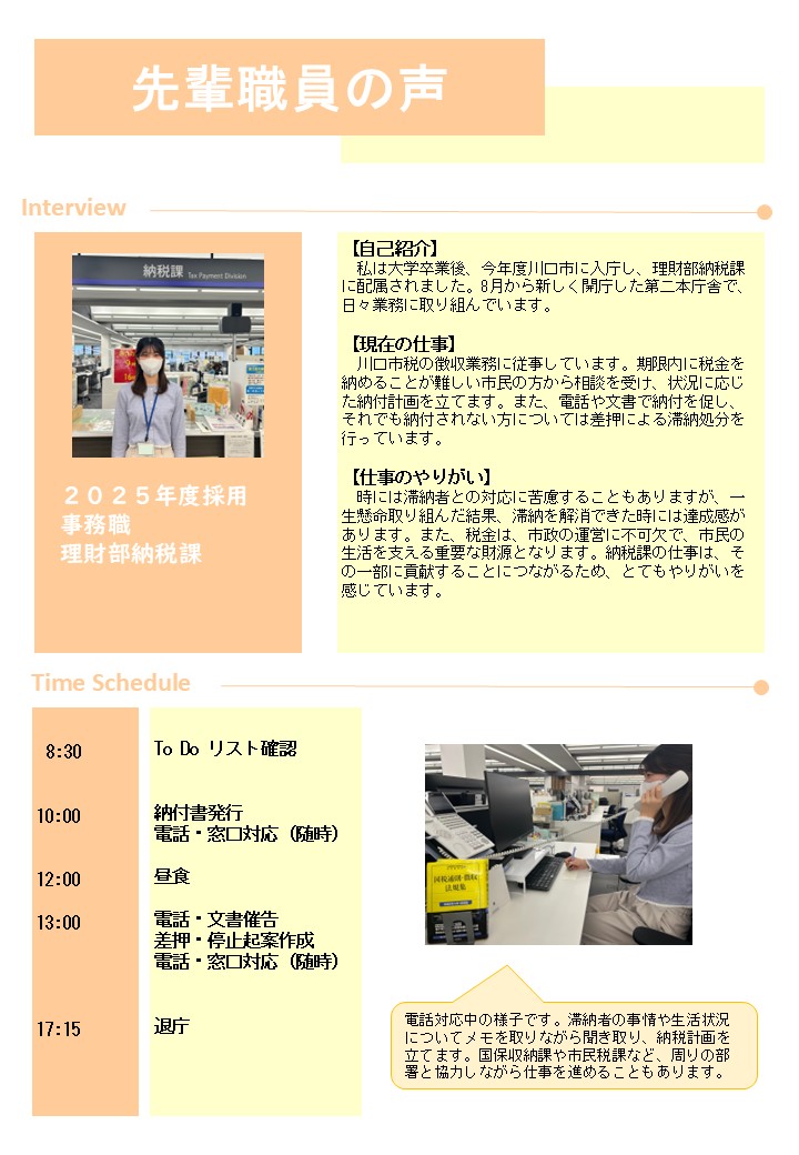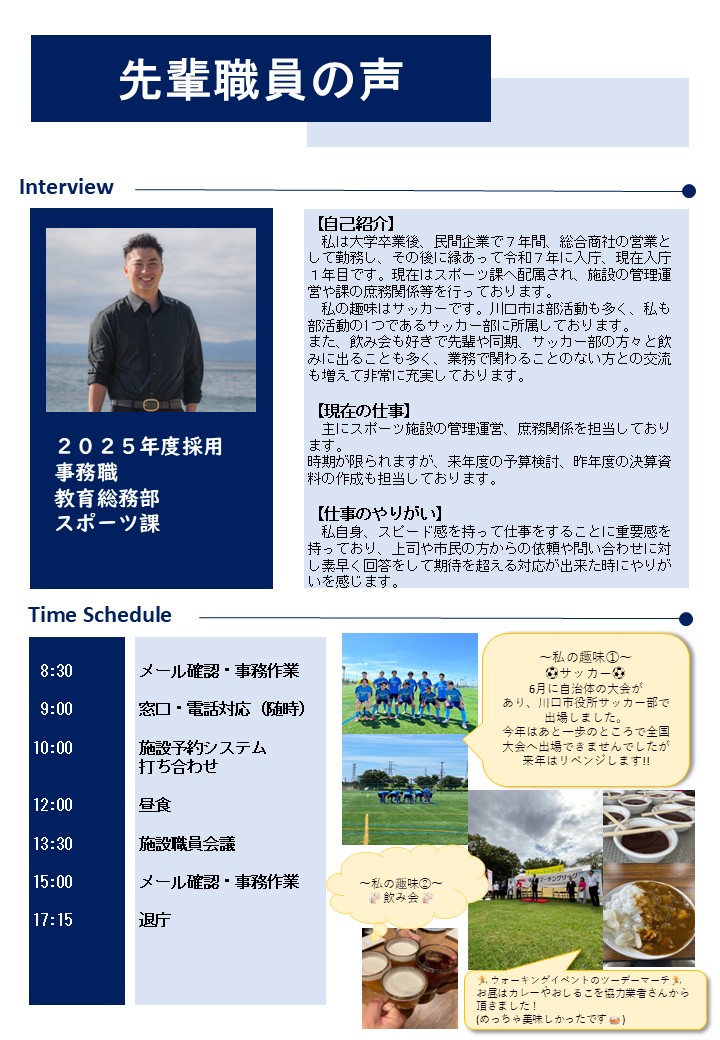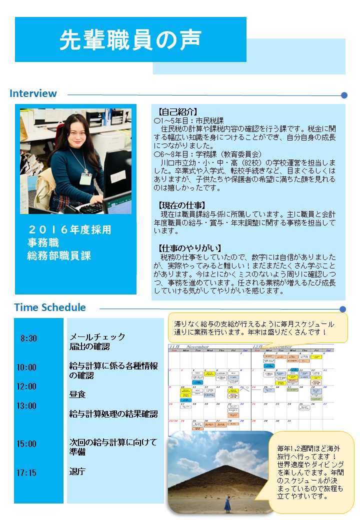 また先輩職員のリアルな一日を覗き見!ということで、登庁から退庁まで『一日のスケジュール』についても紹介しております。是非ご覧ください!