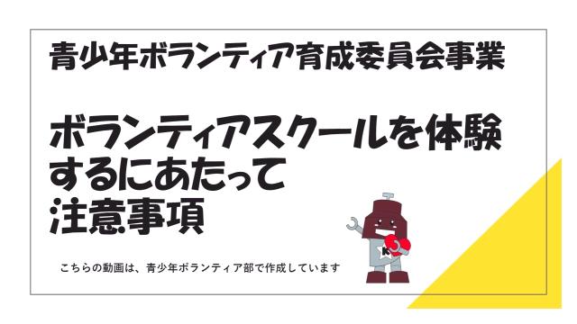 | 事前動画の視聴 | ボランティアスクールの流れが分かる動画を作成しました。 申込み前に、一度ご確認ください。下記画像のリンク先にて視聴できます。 (申込フォームでも視聴することができます。) ![]() |