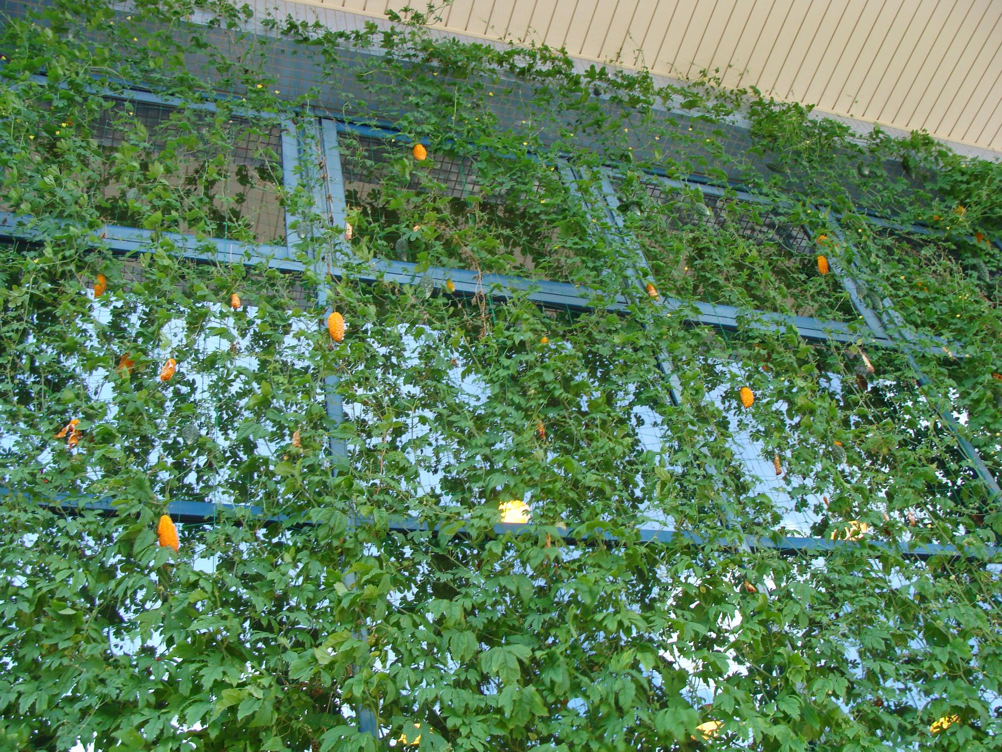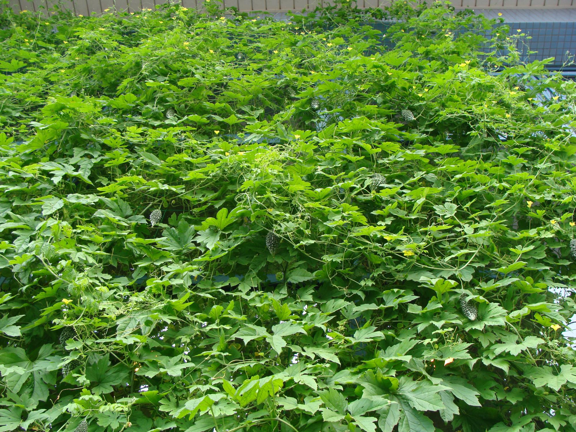グリーンカーテンは、ツル性の植物を建物の壁面や窓を覆うように育てて作る植物のカーテンです。夏場の強い日差しを吸収して室内の温度の上昇を和らげるほか、蒸散作用によって葉から水分が生成されるため涼しさを感じられます。