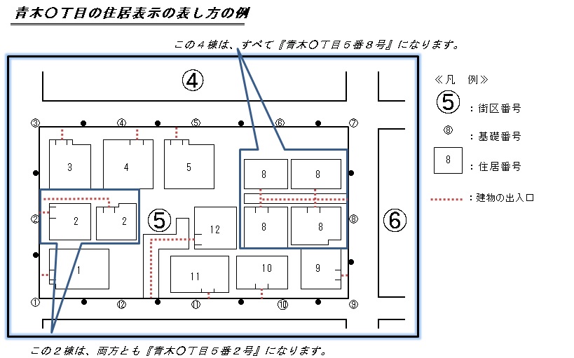 建物ごとにつける番号を「住居番号」といいます。街区の外周に、一定間隔で順に番号をふり(この番号を基礎番号といいます)、建物の主な出入口から街区の外に出る際、通過する基礎番号がその建物の「住居番号」になります。そのため、別の建物であっても同じ基礎番号を通過する場合は同じ住居番号になります。